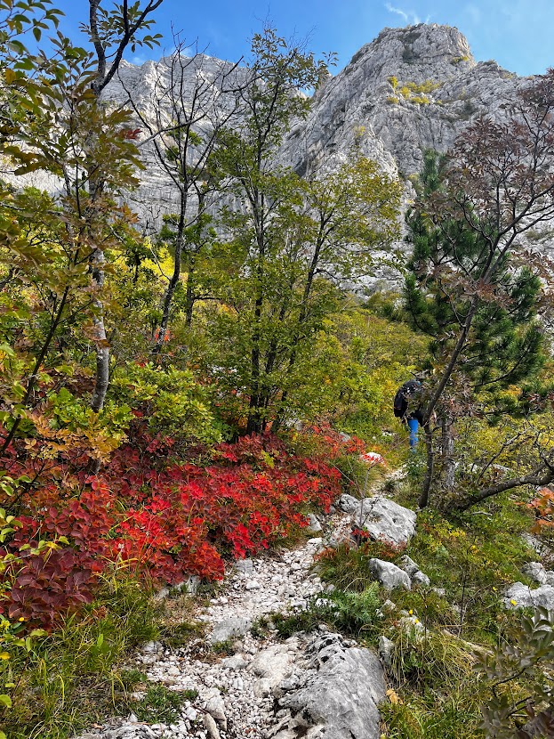 V jesensko obarvanem oktobru nisem dolgo pomišljala, ko sem zagledala objavo programa feratarskega izleta s strani Društva Strmina, ki nas je snubilo na pot hrvaškega pogorja Dinara. Gre za čudovito pogorje, ki se s svojim gorskim masivom razteza na dolžini 84 km. Telefonski klic prijateljici “greš zraven” in sva šli. Odhod na petek pozno popoldne, prihod v večernih urah. Vožnja je dolga in super si je za tak pohodniško – feratarski izlet vzeti 2 dni. V našem primeru cca 370 km (iz Ljubljane do kraja Kijevo, kjer smo imeli namestitev). Jaz bi ostala še vsaj 2-3 dni, saj verjamem, da narava tod okoli Dinare preseneča na polno in ponuja še veliko.