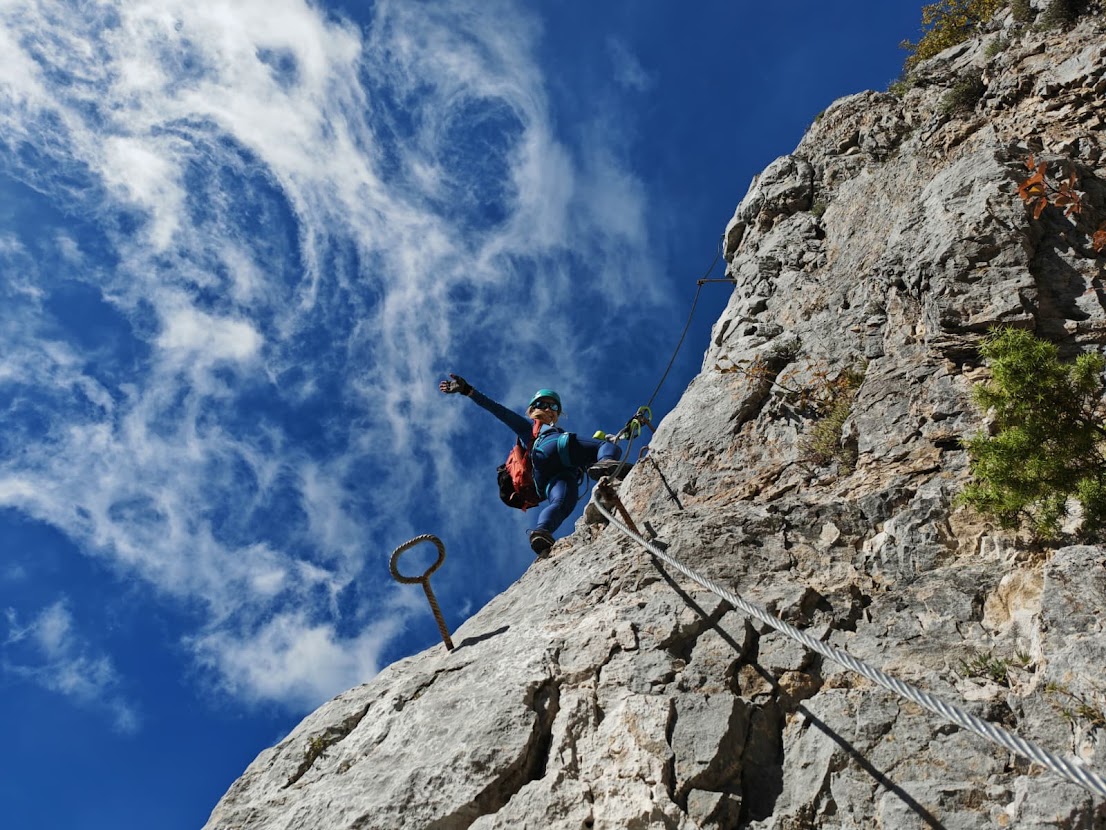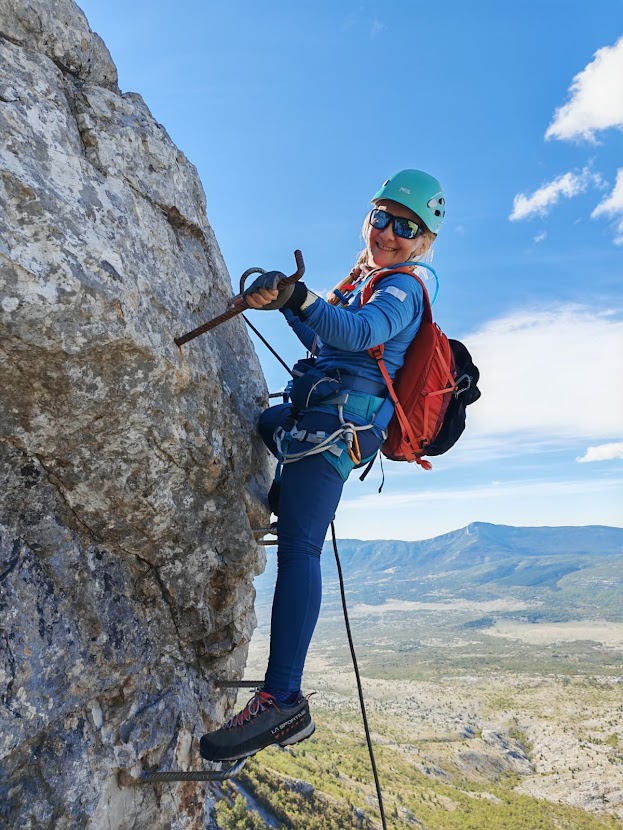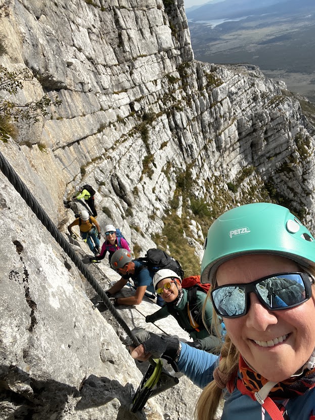 Težko je zapisati na kratko, pa vendar – v enem stavku: 8 ur razgledov, sonca, vetra in prave mere adrenalina! Ferata je izredno lepo speljana, meni osebno je bilo všeč predvsem to, da so bili klini, kovinske stopničke, stopi in drugi oprimki nameščeni dovolj na gosto, da nisem imela tistih neprijetnih občutkov “prekratkih rok”. Na nekaj mestih, predvsem na bolj navpičnih in previsnih odsekih, pa mi je bilo težko najti naravne stopičke, vdolbine oz. izdolbine, da bi se lahko oprla z nogami in povzpela navzgor. Pa sem zato hvaležno sprejela pomoč vodnice Leie, ki je spretno in varno opravila dvig mojega telesa s popkovino (dodatna vrv). Še danes sem ji neskočno hvaležna, ker … iskreno, jaz bi na vsaj 2 mestih kar obtičala :-). Zato toplo priporočam, da se v stene tako dolge in razgibane ferate odpravljate v spremstvu vodnikov ali osebe, ki je bolj izkušena od vas.