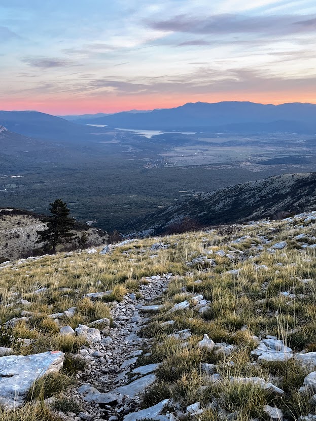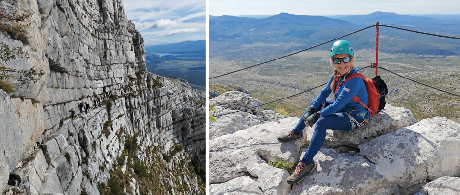 Dinara predstavlja naravno mejo s sosednjo BiH, njena posebnost pa je predvsem v tem, da na njem kraljuje najvišji vrh Hrvaške (Sinjal, 1831m). Na mogočno, skoraj neskončno gorovje se odpira pogled že iz okoliških cest. Ko smo prispeli do njenega skalnega izhodišča za vzpon po ferati in sem naredila prvi oprimek jeklenice, si v tistem trenutku niti najmanj nisem predstavljala, koliko korakov in oprijemov me še čaka. In kakšni razgledi – uau!!